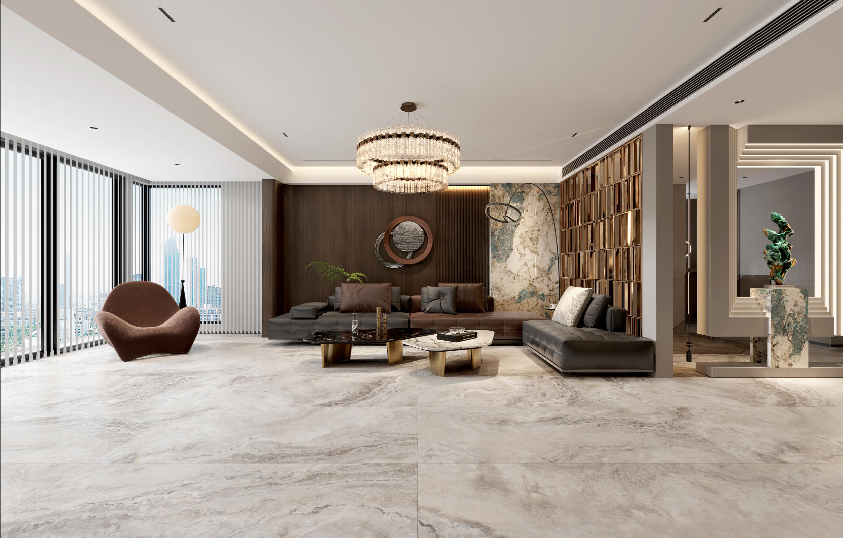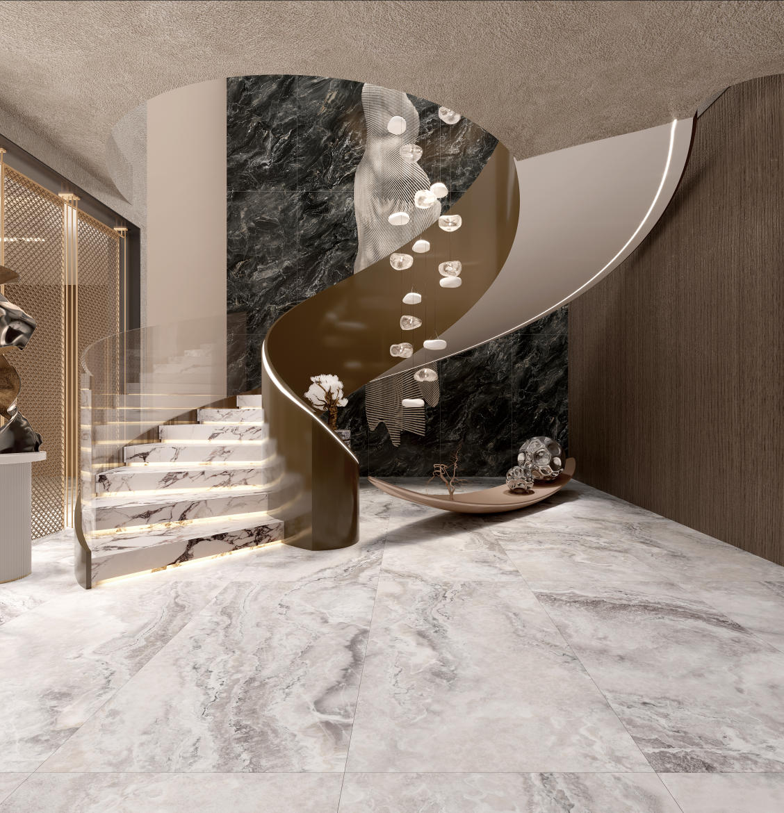 汲取瑪瑙石的自然精髓,復(fù)刻著大地脈絡(luò)那蜿蜒曲折的線條,以棕色的溫暖沉穩(wěn)為基調(diào),輔以白色紋理如云朵般輕盈飄渺。肆意流動(dòng)的紋理宛如山川河流,細(xì)膩或粗獷,賦予動(dòng)態(tài)的生命力,如同自然界的河流在山間自由穿梭。既展現(xiàn)了瑪瑙石的溫潤,又不失現(xiàn)代感的簡潔與明快。